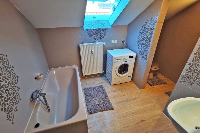 Das Badezimmer beinhaltet eine Badewanne, eine separate Dusche, ein Waschbecken mit Spiegel und eine Waschmaschine, sowie Toilette. Im Flur gibt es die Möglichkeit Kleidung aufzuhängen, sowie einen Abstellraum im Küchenbereich.